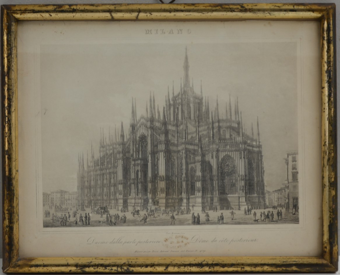 Bramati incisore. "Duomo dalla parte posteriore" incisione del sec. XIX (cm 26x32) In cornice dorata (difetti)