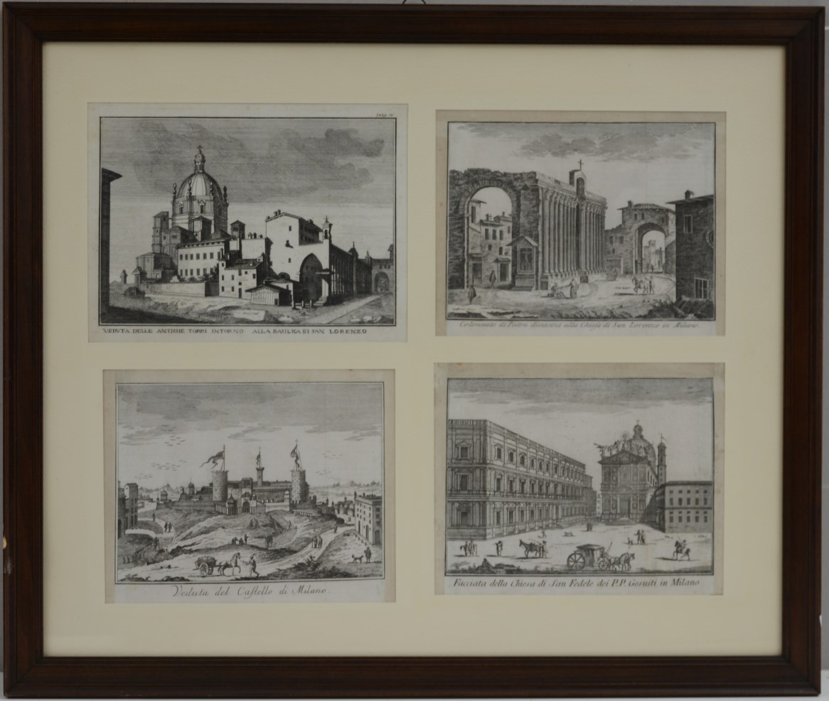Gruppo di quattro acqueforti del sec. XVIII raffiguranti scorci di Milano. In un'unica cornice (difetti)