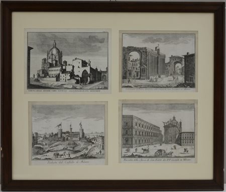 Gruppo di quattro acqueforti del sec. XVIII raffiguranti scorci di Milano. In...