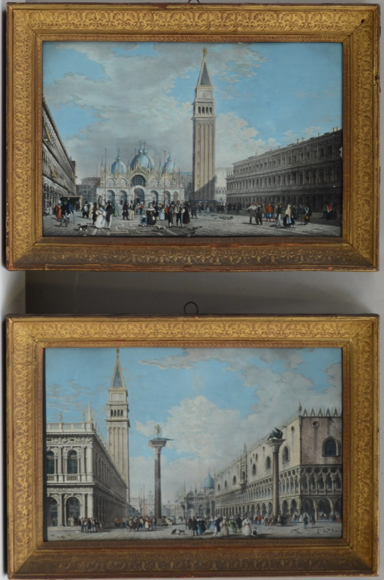 Coppia di incisioni acquerellate del sec. XIX raffiguranti piazza San Marco (cm 26x40) (difetti)