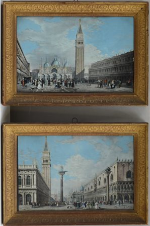 Coppia di incisioni acquerellate del sec. XIX raffiguranti piazza San Marco...