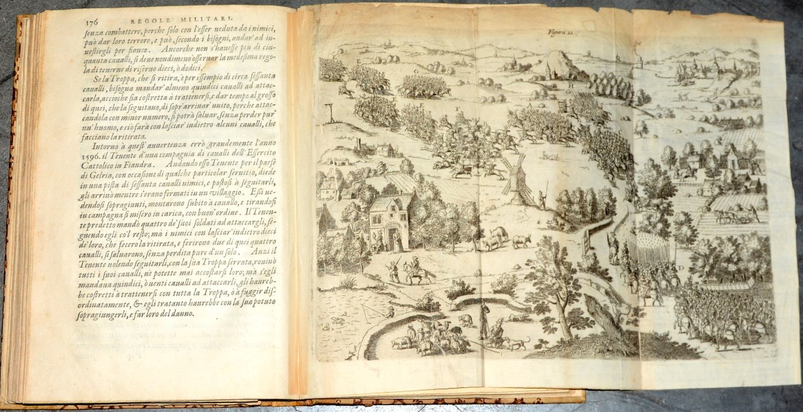 Ludovico Melzi, Regole militari. Anversa: Gioacchino Trognesio, 1611. Vol. in folio, rilegato in mezza pergamena e piatti cartonati (difetti)