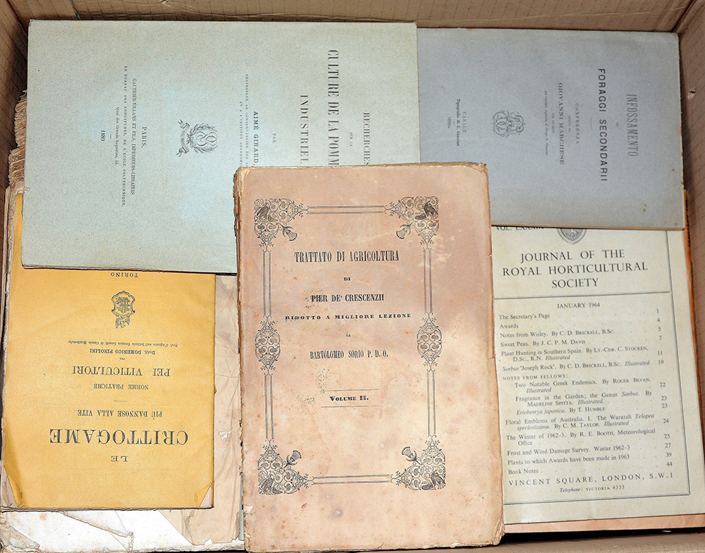 (Libri) Lotto composto da due cartoni contenenti numerosi volumi di vario argomento, fra cui l'agricoltura, l'orticoltura, l'economia e altre materie tecnico-scientifiche. Di epoche differenti (difetti)