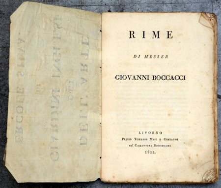 (Libri) Giovanni Boccaccio. Rime di messer Giovanni Boccacci. Livorno, presso Tommaso Masi e Compagno cÚ Caratteri Bodoniani, 1802. Le Rime edite e inedite sono state per la prima volta raccolte e pubblicate. Gamba. 231). Volume in 8∞, legatura coeva cartonata gravemente compromessa (fioriture e gore)