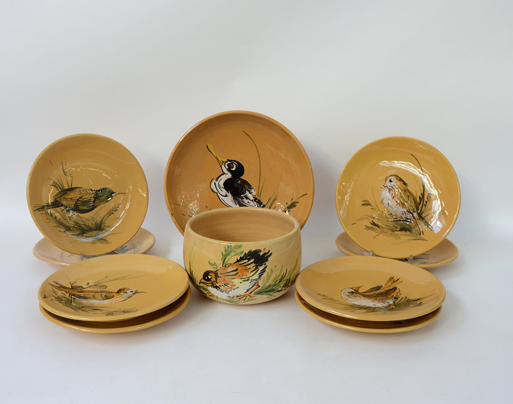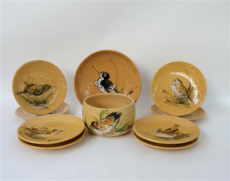 Locatelli Gabriella Servizio da tavolo composto da dieci oggetti tra piatti e ciotole decorati in policromia a volatili