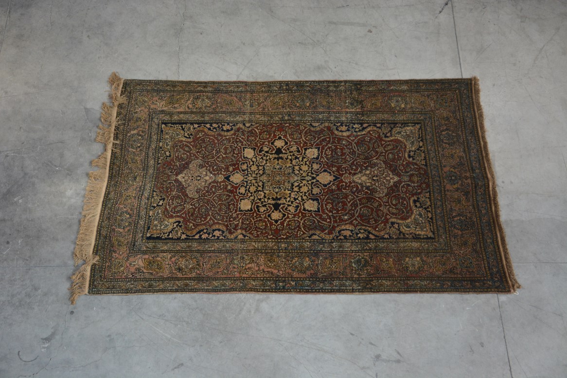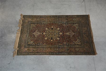 Tappeto Sarouk, Persia inizio secolo XX. Disegno a medaglione beige con fondo blu scuro su campo rosso(223x140) (difetti)