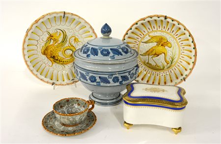 Lotto composto da una tazza con piatto Mularoni, una scatola Limonges e tre oggetti diversi in maiolica