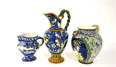 Manifatture diverse. Lotto composto da tre versatoi in ceramica decorati a paesaggi e decori neorinascimentali