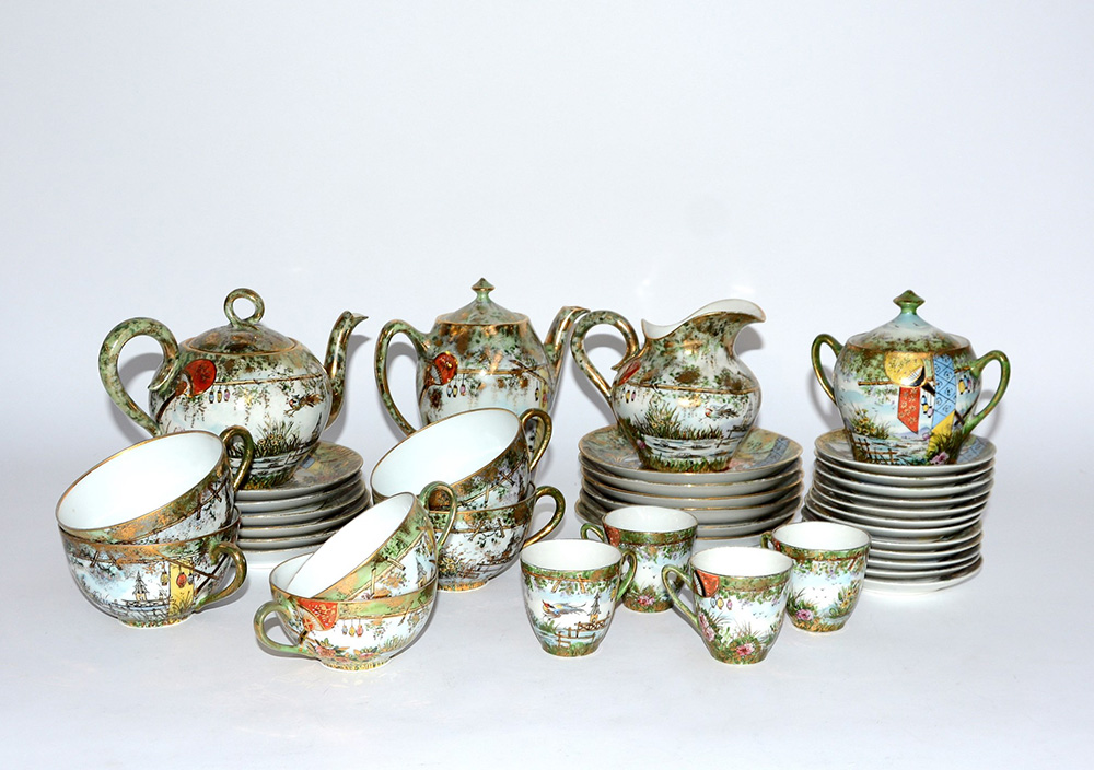 Parte di servizio da tË e caffË in porcellana decorata in policromia e dorature a paesaggi orientali. Composto da teiera, zuccheriera, caffettiera, lattiera, dodici tazze di diverse misure con piattini, undici tazzine con piattini (difetti)