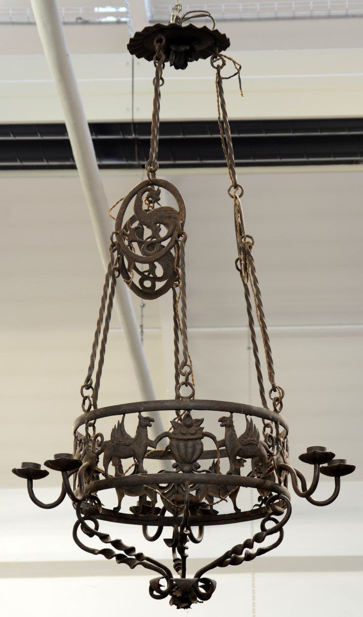 Lampadario in ferro battuto decorato ad animali fantastici e cesti con frutta