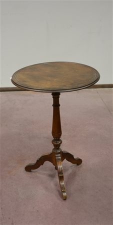 Tavolo da salotto di forma tonda con gamba centrale a colonna tornita terminante e tre piedi scanalati (d. cm 51 x h. cm 78) (difetti)