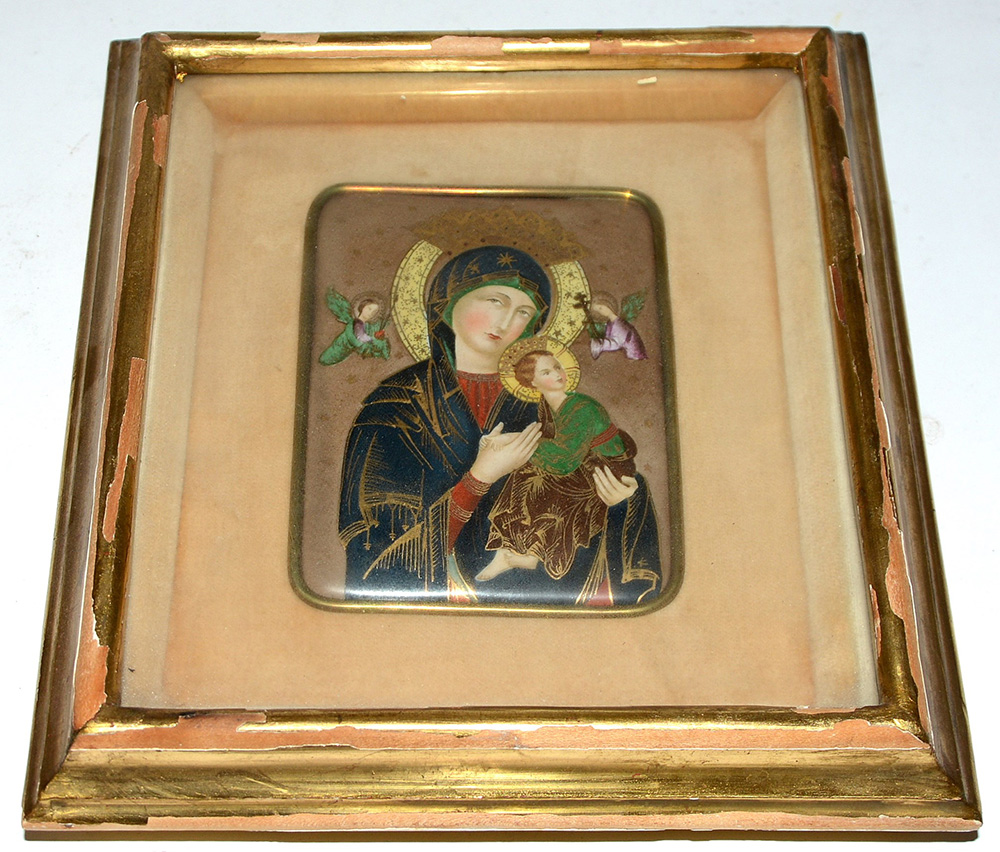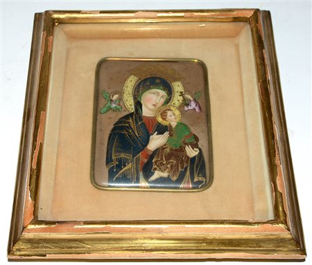 Placca in porcellana decorata in policromia raffigurante Madonna con Bambino...