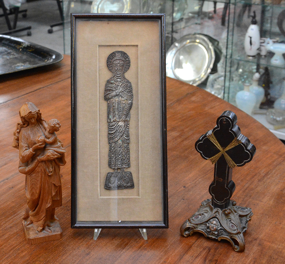 Lotto composto da un bassorilievo in metallo argentato, una base porta crocifisso del sec. XIX e una statuetta lignea raffigurante Madonna con Bambino (difetti e mancanze)