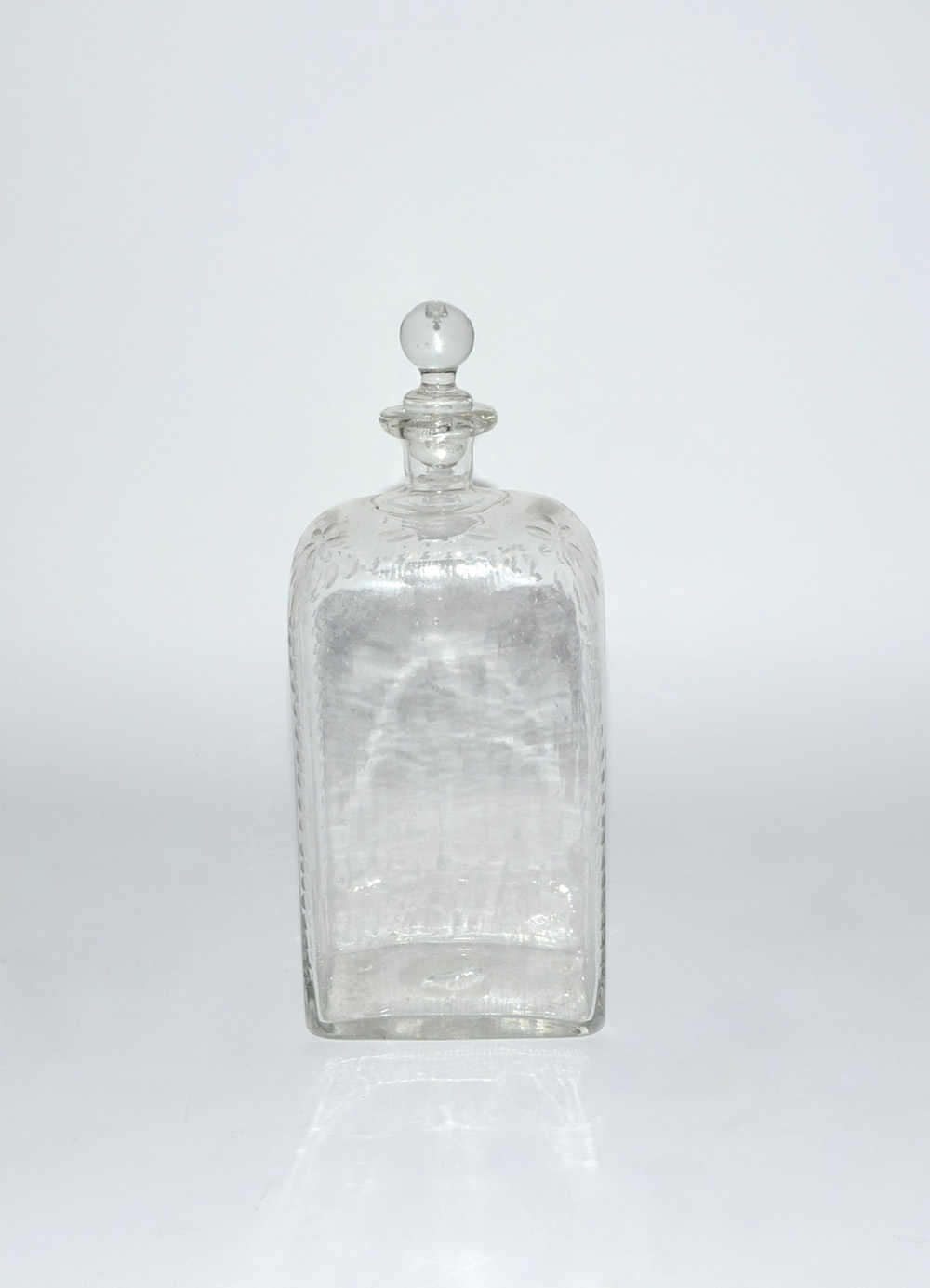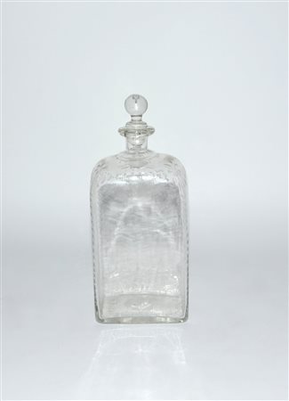 Manifattura veneziana inizio sec. XIX. Bottiglia in vetro incolore decorata nei bordi a motivi stilizzati (h. cm 27)
