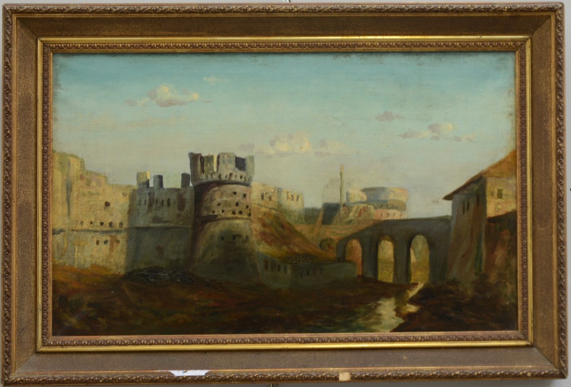Scuola del secolo XIX "Paesaggio con castello" olio su tela (cm 37x60). In cornice (lievi difetti)