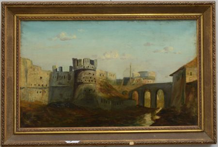Scuola del secolo XIX "Paesaggio con castello" olio su tela (cm 37x60). In...