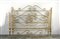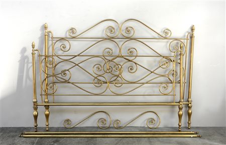 Letto in ottone a due piazze decorato a volute, montanti con pinnacoli (difetti)