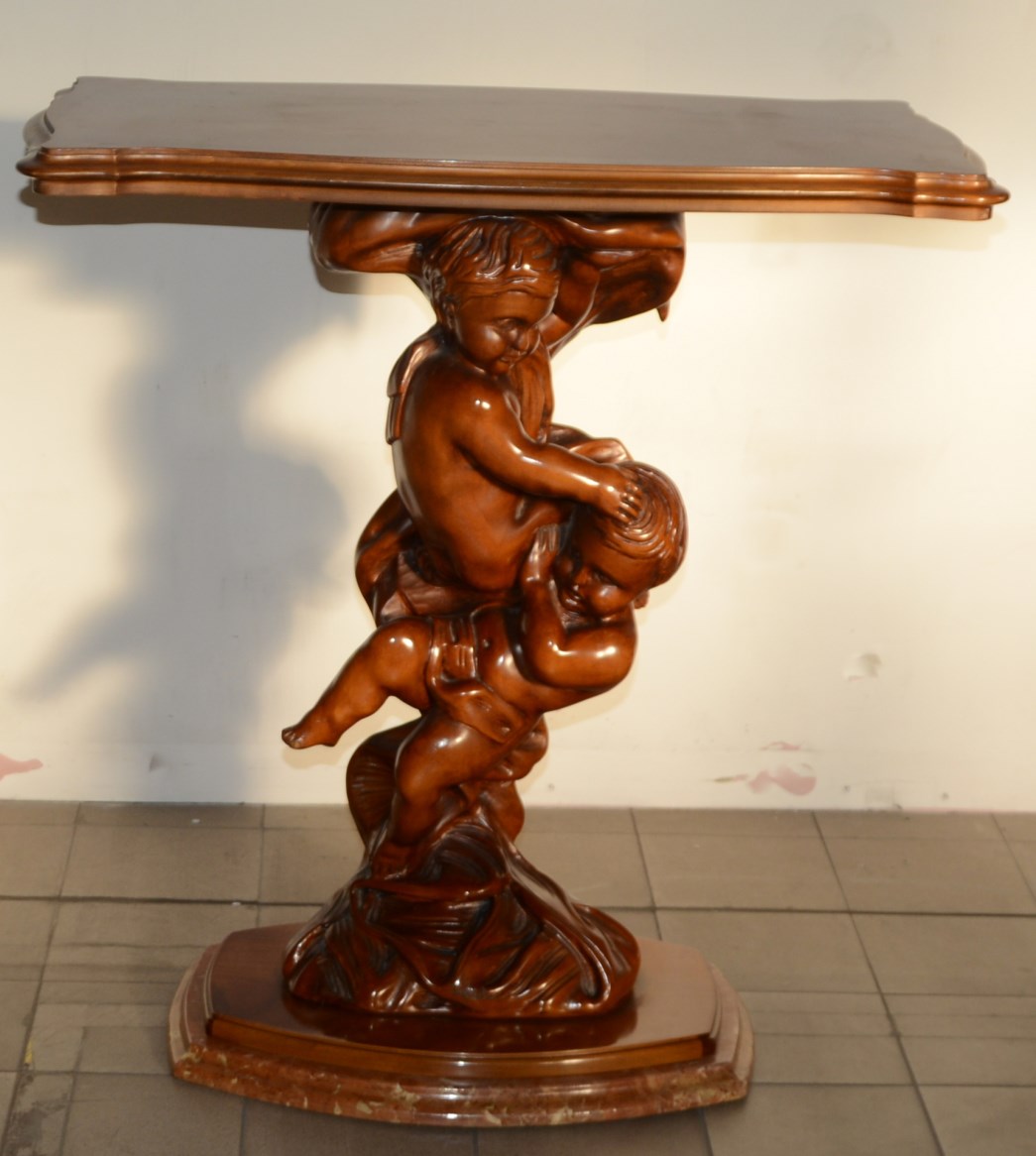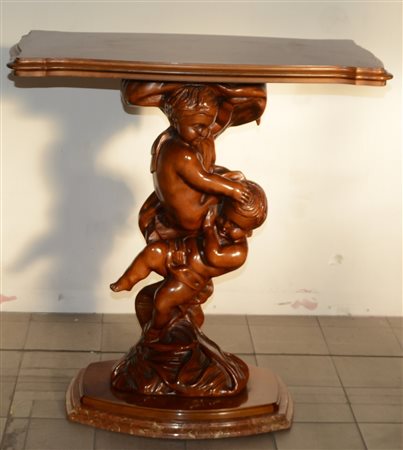 Console con colonna in legno intagliato raffigurante due putti giocosi, piano...