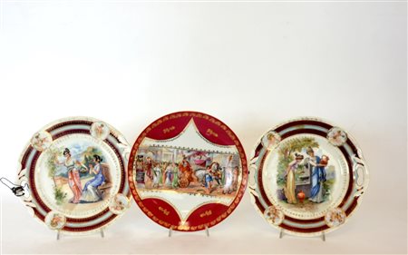 Manifattura di Vienna, lotto di tre piatti decorativi (d cm 24,5) (lievi difetti)