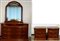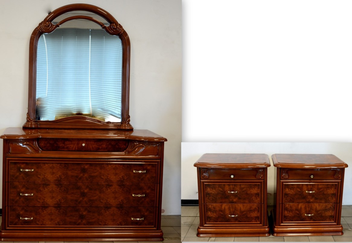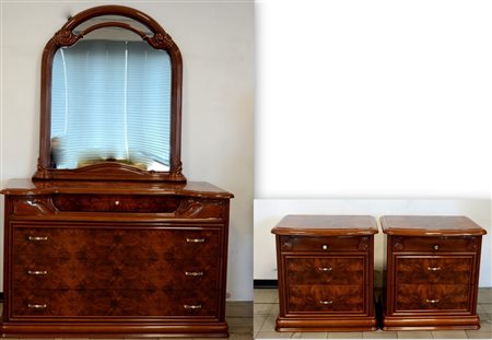 Fornitura da camera da letto moderna composta da un comÚ a tre cassetti grandi e uno piccolo sottopiano (cm 133x84x53) completo di specchiera (cm 101x112) e due comodini a tre cassetti (lievi difetti)