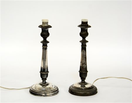 Coppia di candelieri in argento montati a luce elettrica (h cm 26) secolo XIX (difetti)