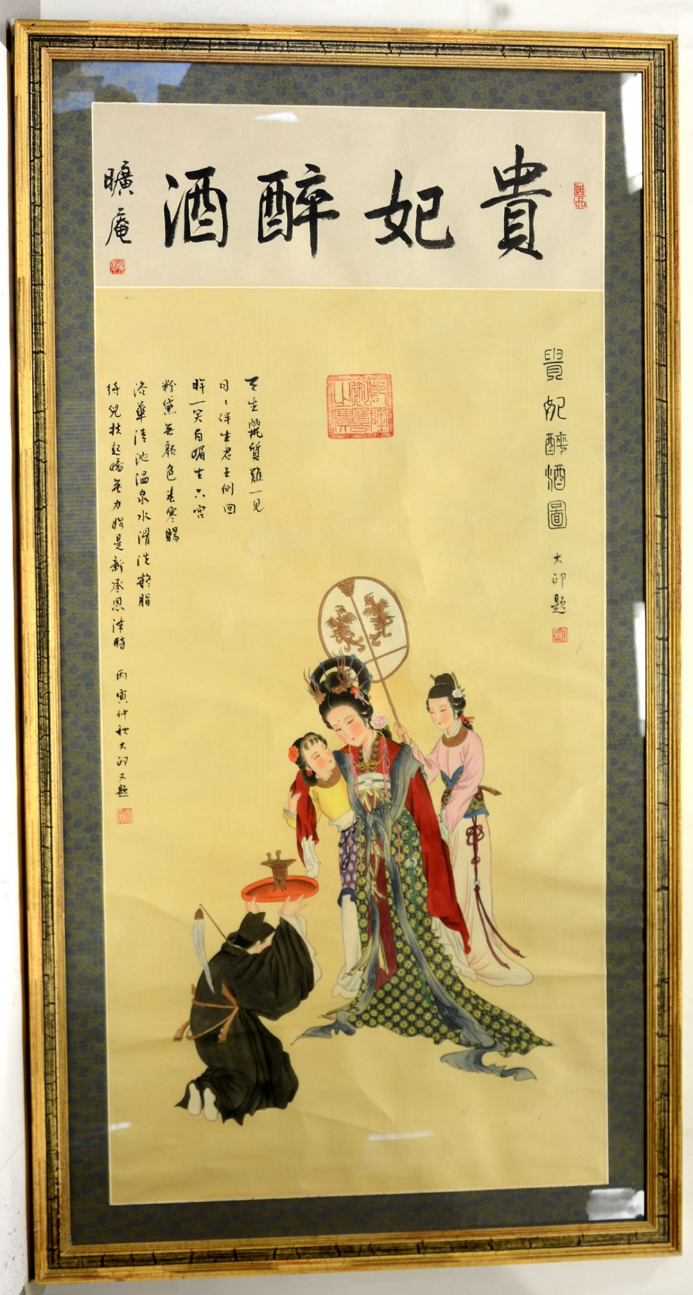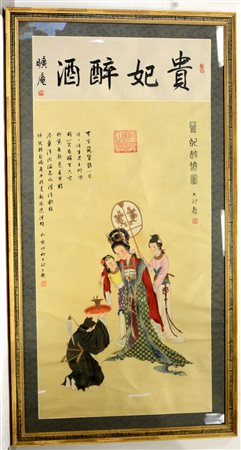 Inchiostro e colore su seta raffigurante dama con servitori, con sigilli e calligrafia, in cornice, Cina, sec. XX (cm† 138x70) (lievi difetti)