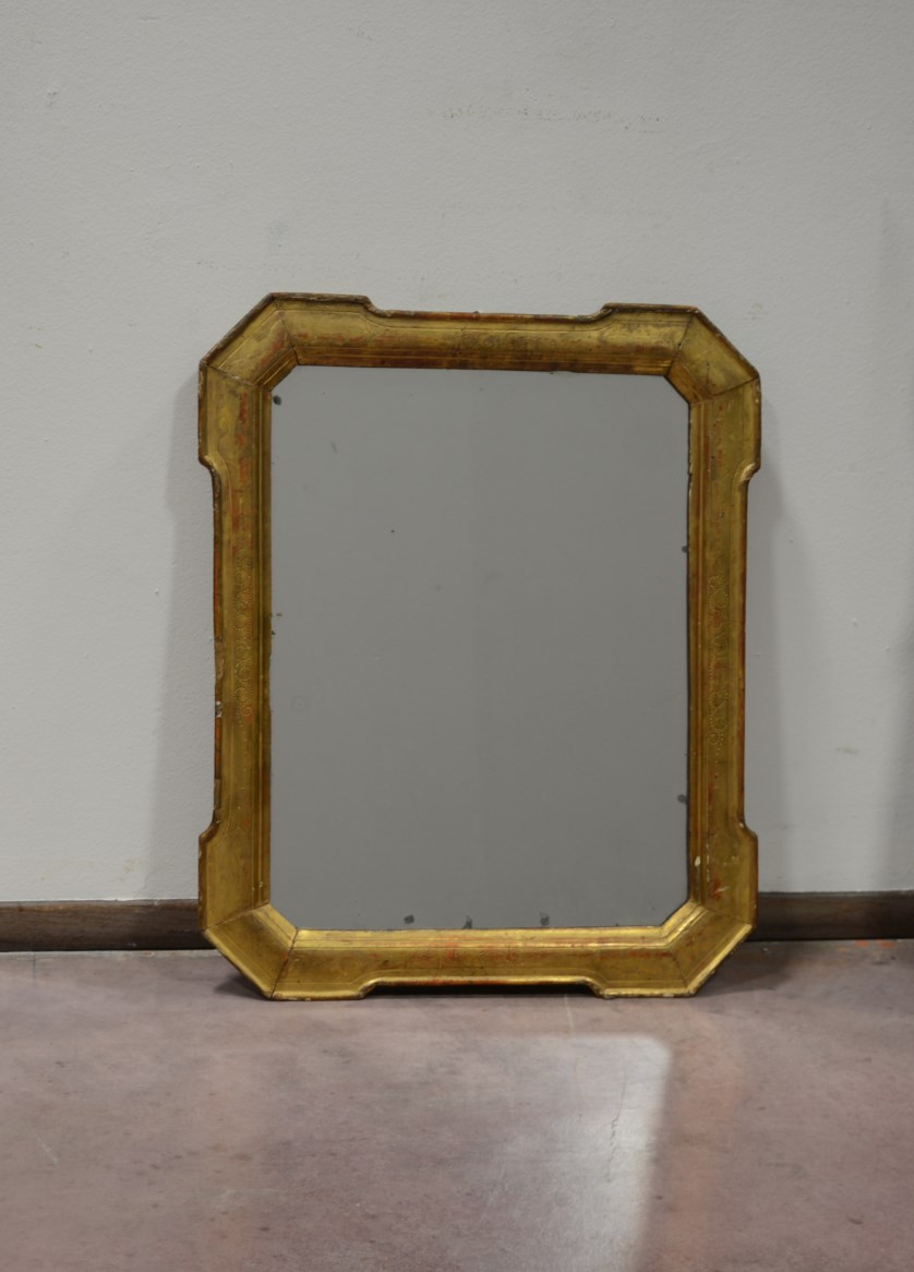 Specchiera a vassoio in legno dorato e bulinato. Sec XIX (difetti) (cm 65x77)