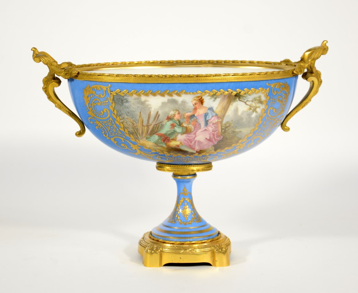 Manifattura francese. Ciotola biansata in porcellana a fondo azzurro decorata a riserve policrome raffiguranti scene galanti e paesaggi. Ghiere in metallo dorato (cm 24x32)