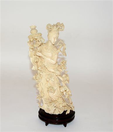Scultura in avorio raffigurante una figure femminile con base in legno, Cina, sec. XX (h. cm 23) (difetti e mancanze)