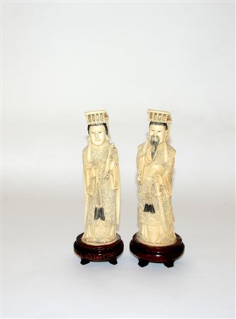 Lotto di due sculture in avorio raffiguranti consorti, basi in legno, Cina, sec. XX (h cm 20) (lievi difetti)