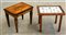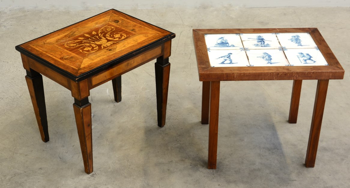Lotto composto da un tavolino con piano decorato a piastrelle e uno intarsiato