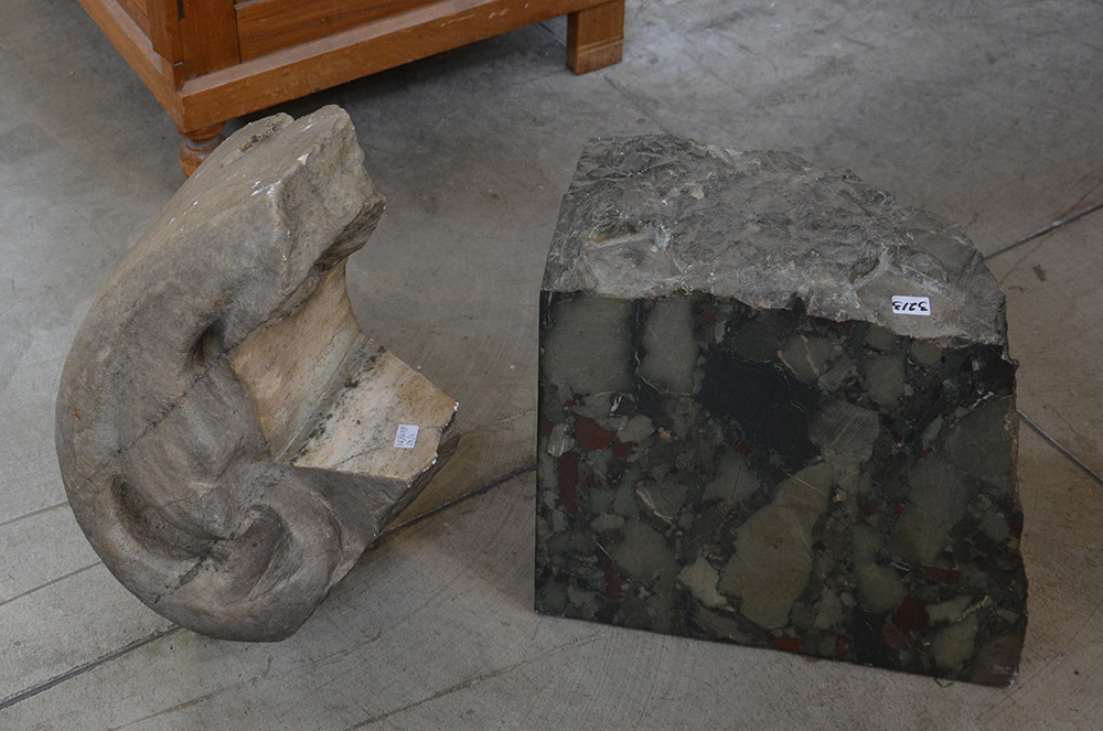 Lotto composto da un frammento di capitello in marmo bianco e una base per scultura in marmo