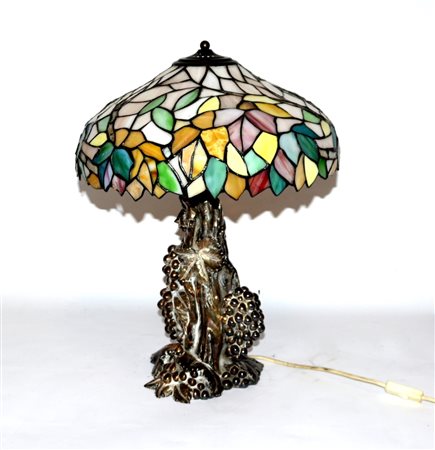 Lampada da tavolo con base in lamina d'argento a pampini e grappoli d'uva, paralume in pasta vitrea legata a piombo (h cm 55) (difetti)