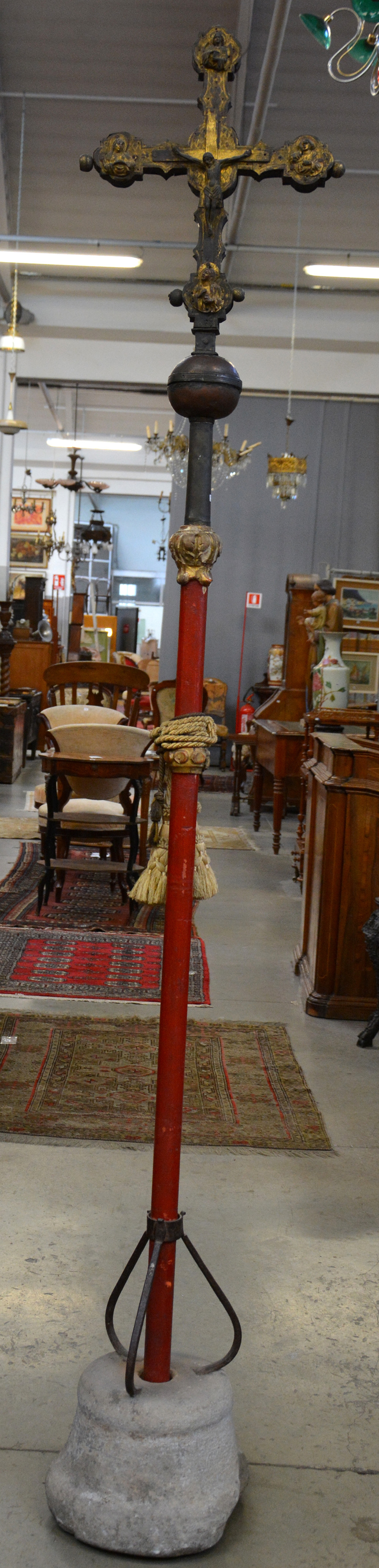 Antica croce pastorale con Cristo e Santi in ottone e rame con supporto in...