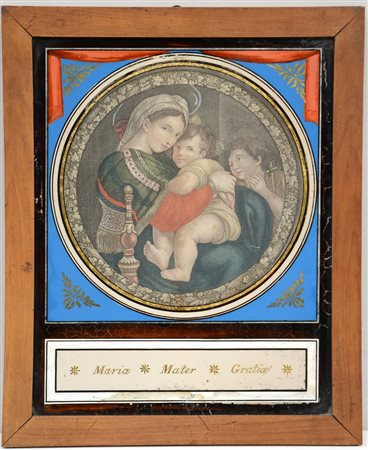 Stampa del sec. XIX raffigurante Madonna con bambino e San Giovannino entro cornice con vetro dipinto