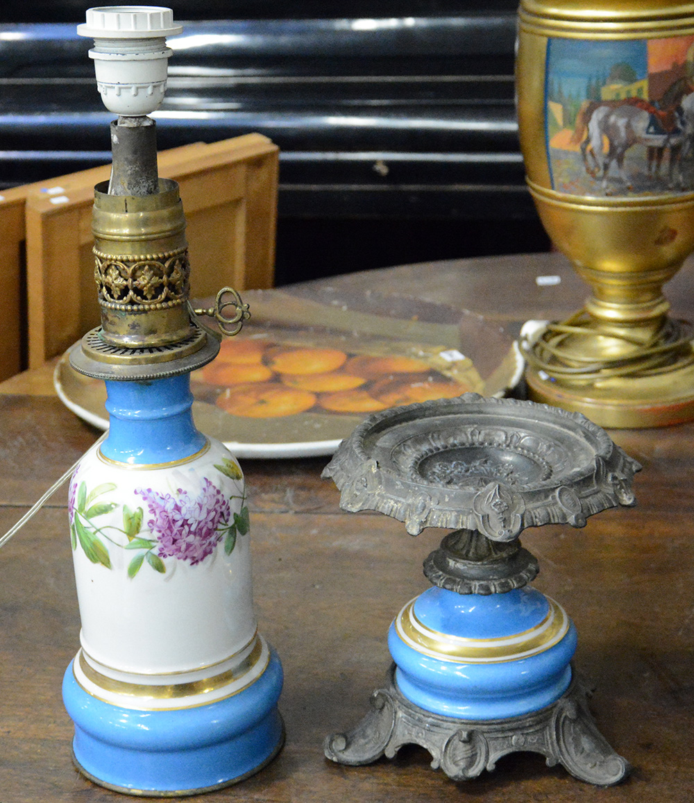 Lotto composto da una lampada e un'alzatina in porcellana policroma e metallo (difetti)