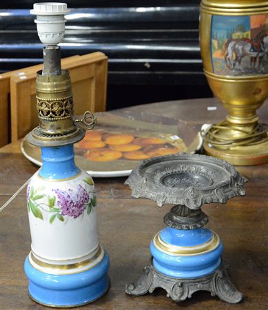 Lotto composto da una lampada e un'alzatina in porcellana policroma e metallo...