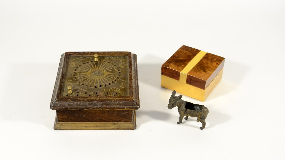 Lotto composto da due scatole con coperchi e una piccola scultura raffigurante asinello (difetti)