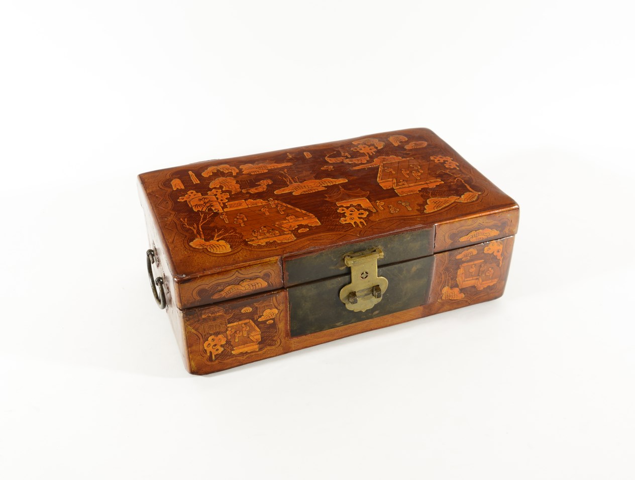 Scatola rettangolare laccata con manici in metallo e decorazione di...