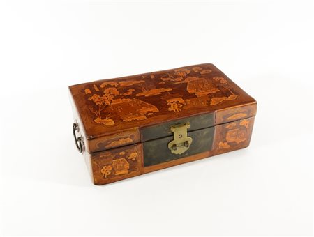 Scatola rettangolare laccata con manici in metallo e decorazione di paesaggio, con marchio e calligrafia sul fondo del coperchio, accompagnata da certificato (difetti e mancanze)