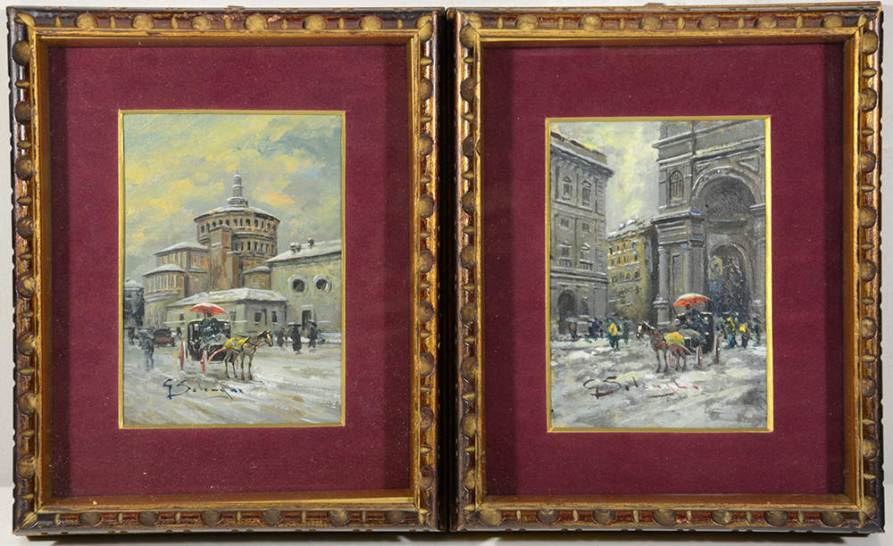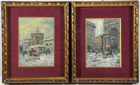 Lotto composto da due dipinti raffiguranti scorci di Milano ad olio su compensato (cm 18x13) firmati Solenghi. In cornici