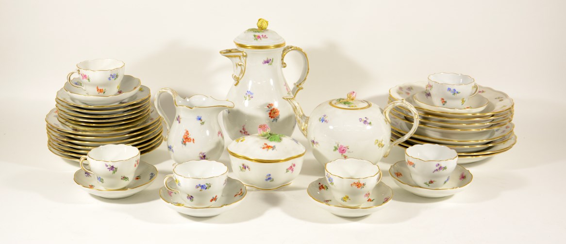 Parte di servizio in porcellana Meissen con decoro a fiori sparsi, composto da quattro piani, quattro fondi, sette piccoli, sei tazze con doppio piattino, teiera-caffettiera, zuccheriera, lattiera, sec. XX