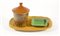 Un vassoio, un posacenere, un vaso con coperchio in ceramica marrone e verde...