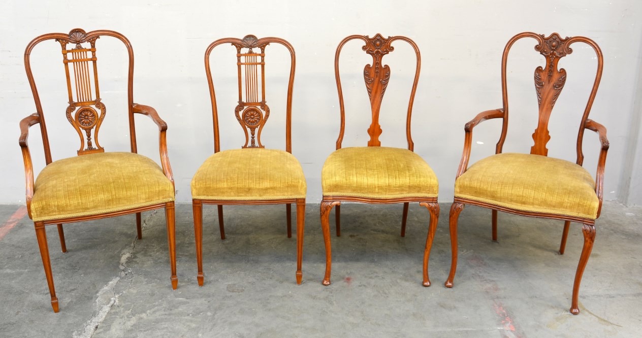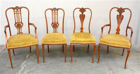 Una poltrona e una sedia in stile inglese, con cartella intagliata a volute e sedile rivestito in velluto, unito a una poltrona e una sedia con cartella a lira e sedile in velluto