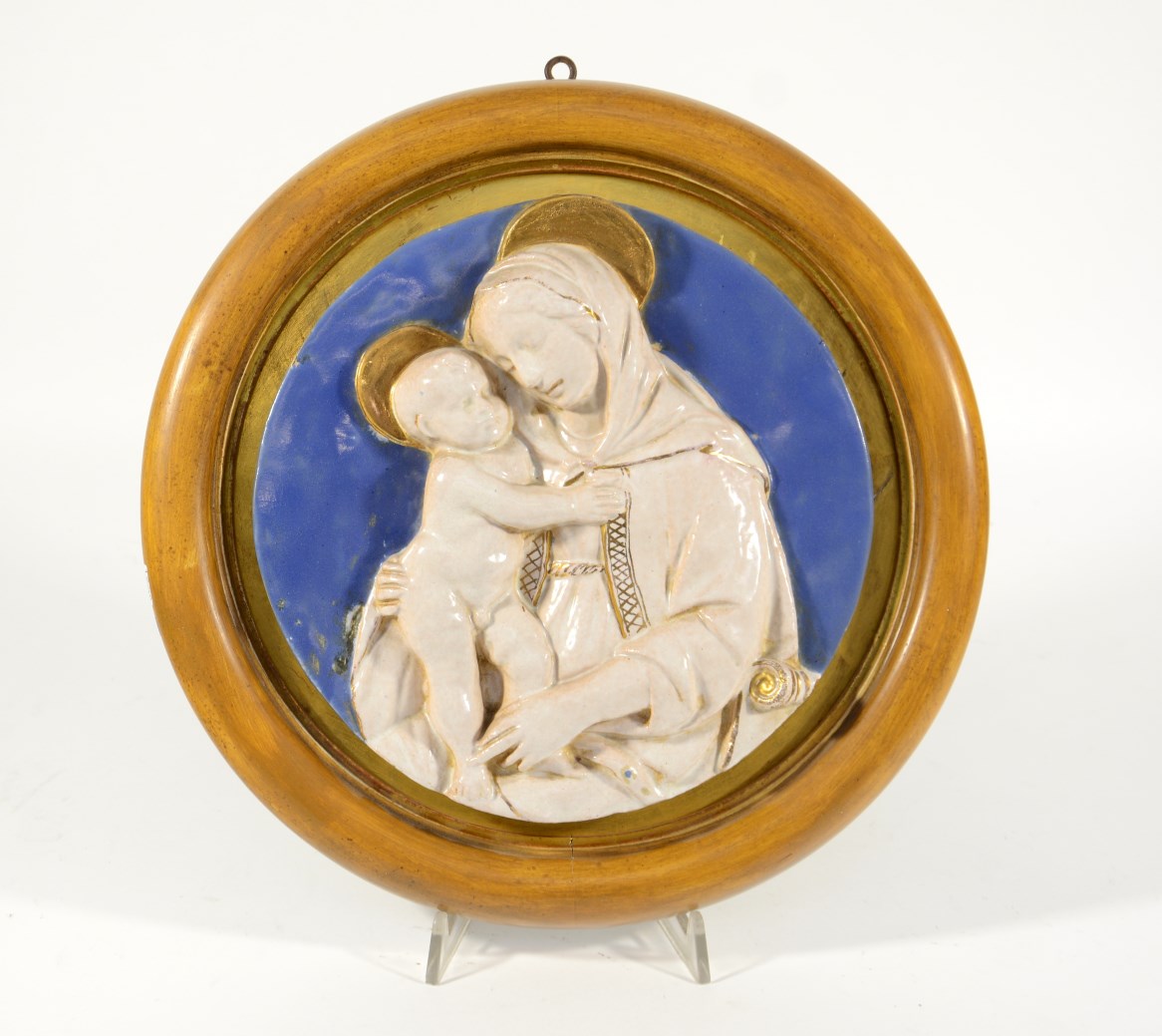 Tondo in maiolica bianca e oro su fondo azzurro, raffigurante "Madonna col Bambino", in cornice (diam. cm 24,5)