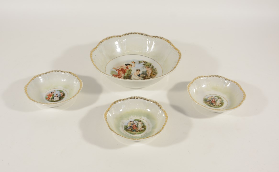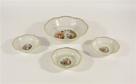 Parte di servizio da macedonia in porcellana decorato con scene mitologiche, composto da una ciotola e tre coppette (diam. Max cm 23 ) (difetti)