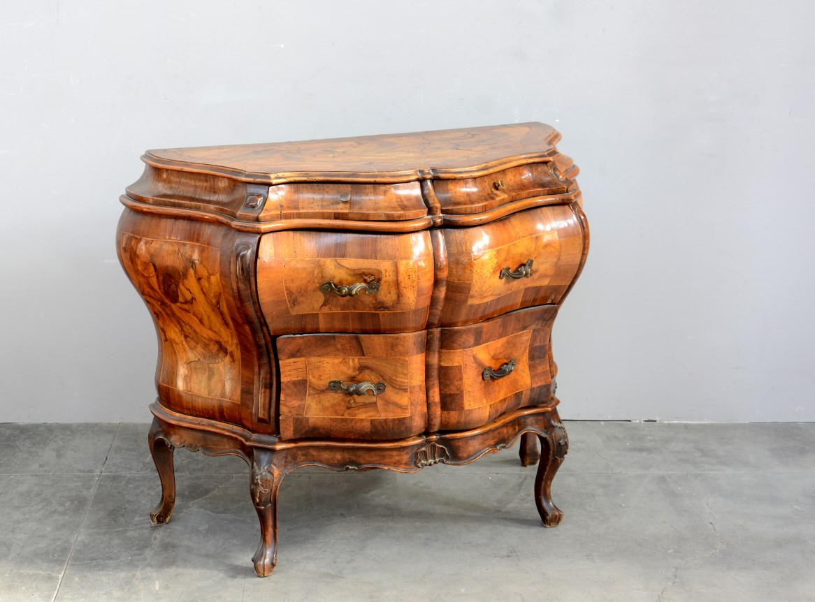 Comoncino di forma bombata lastronsato in noce e radica con due cassetti piccoli e due grandi sul fronte (cm 102x80x48)