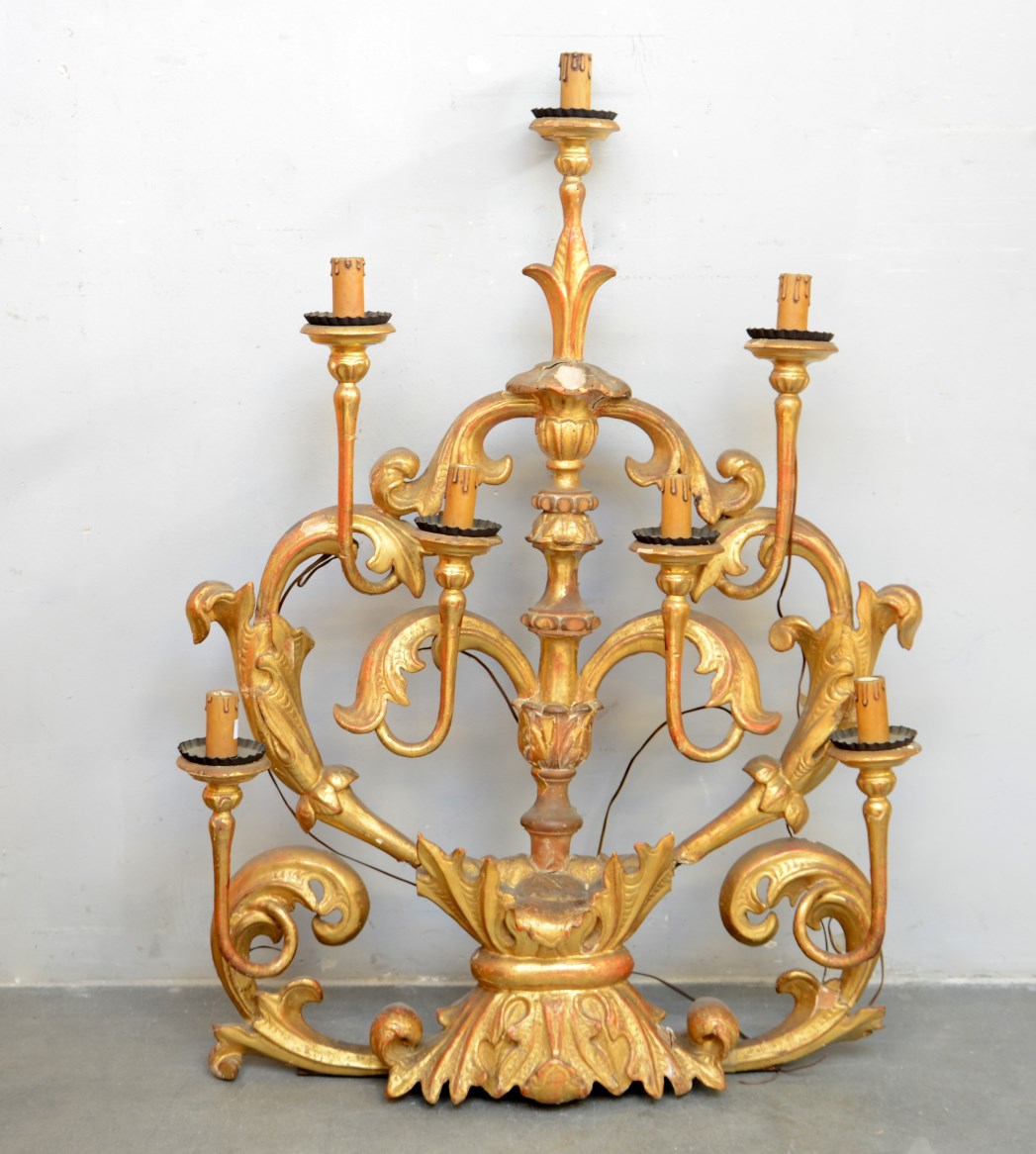 Applique in legno dorato, intagliato, a volute e riccioli. Porta candele...