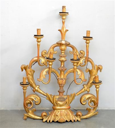 Applique in legno dorato, intagliato, a volute e riccioli. Porta candele sagomati secolo XIX ( cm 92x70) (difetti e restauri)