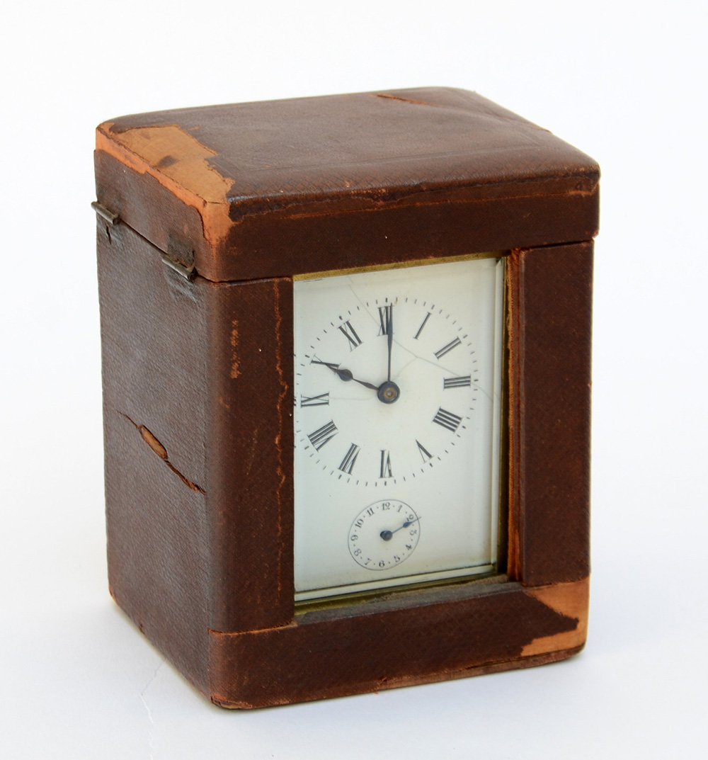 ANONIMO Officier da viaggio con tempo e sveglia, quadrnte in smalto bianco con numeri romani, in custodia (h cm 15 circa, comprensivo di maniglia) (difetti, scappamento sostituito, rotture al quadrante)